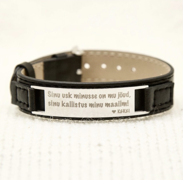 See metallplaadiga nahast käevõru on väga ilusa disainiga ning on meie läbi aegade kõike populaarsem toode. Graveeringu käevõrule võid ise vabalt valida - olgu selleks siis tähenduslik sõnum, olulise paiga koordinaadid, armsa inimese sõrmejälg.... Võimalusi on piiramatult! Samuti on võimalik graveerida käevõrule käsitsi kirjutatud sõnumit.