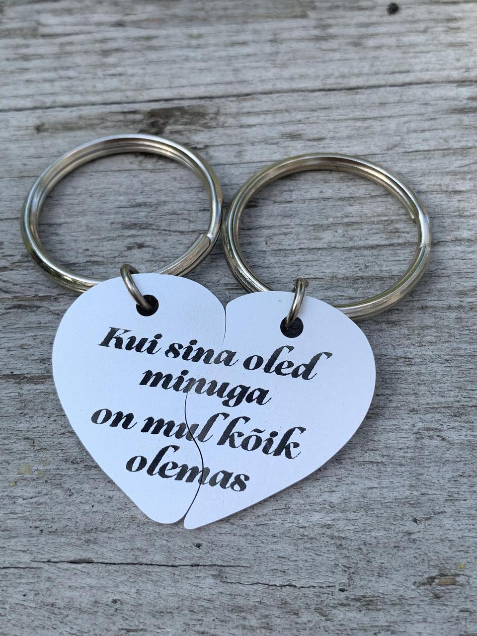 Võtmehoidjate komplekt "süda" koosneb kahest võtmehoidjast, kahest südame poolest. Üks jääb sinule, teise kingid edasi oma kallimale. Võimalik on graveerida teksti nii, et see oleks südamepooled kokku pannes terviklil, või siis saame graveerida mõlemale poolele eraldi sõnumi - just nii nagu sina soovid! Lase fantaasial lennata ja loo oma kallimale armas sõbrapäeva kingitus!